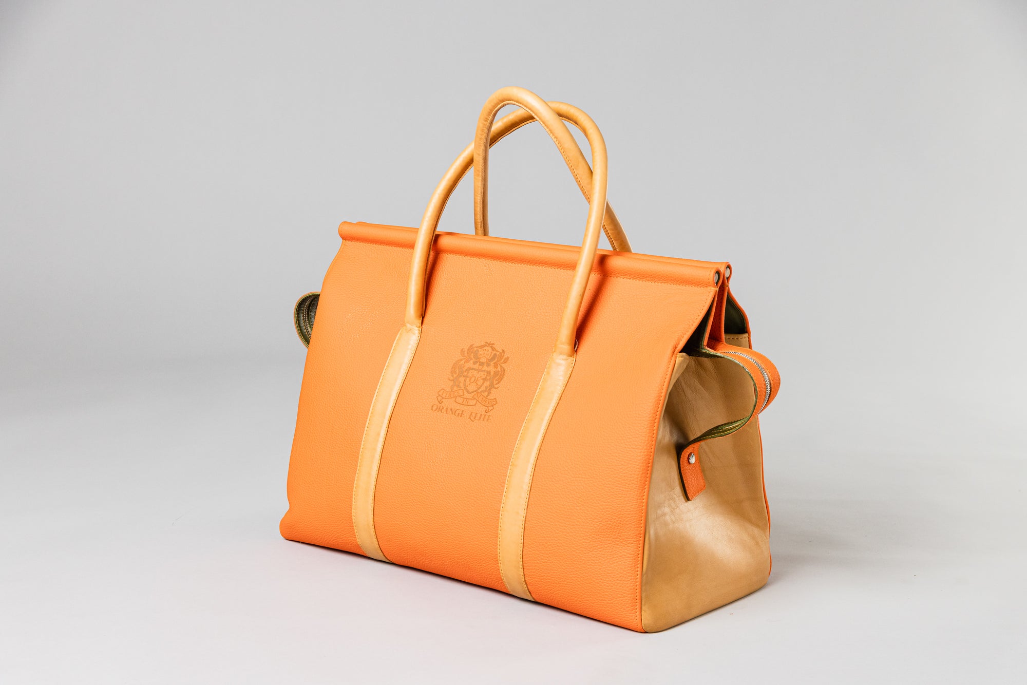 This luxurious handbag is made entirely from 100% cowhide leather. The outer material is premium French full-grain leather in vibrant red-orange, while the sides are crafted from the same orange leather like the blocktraveler for a harmonious design. Inside, it features smooth green leather from Italy.