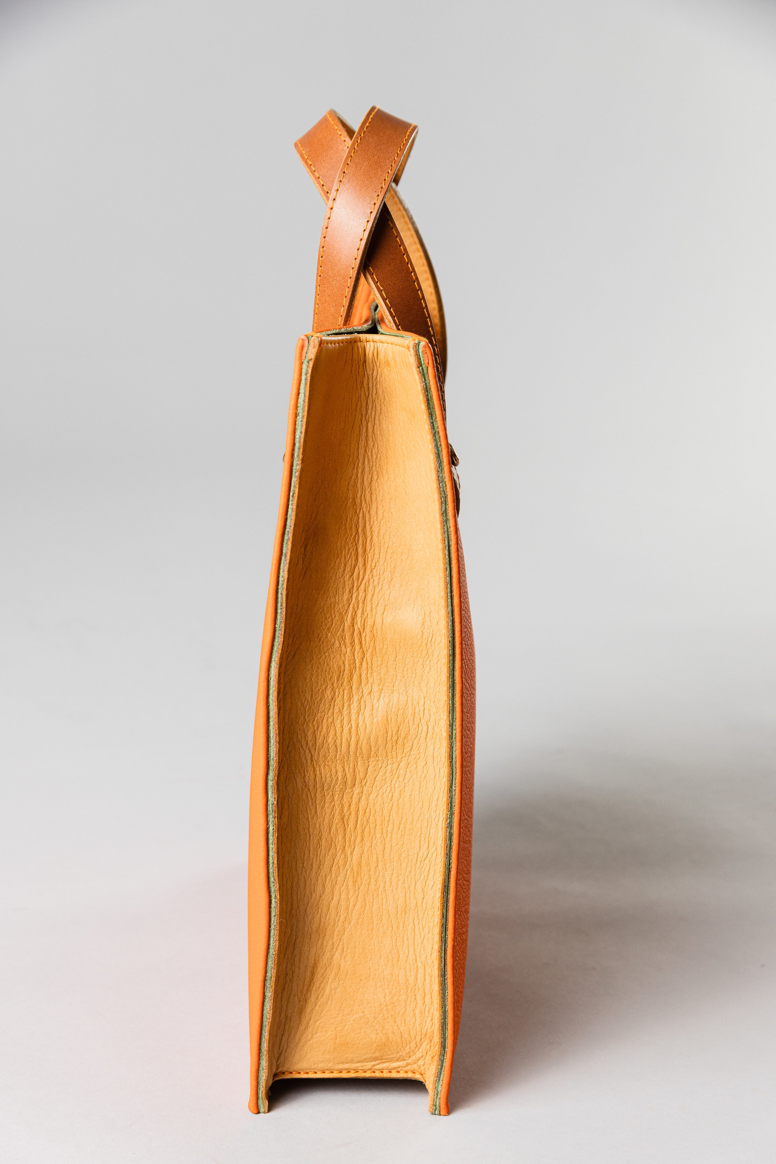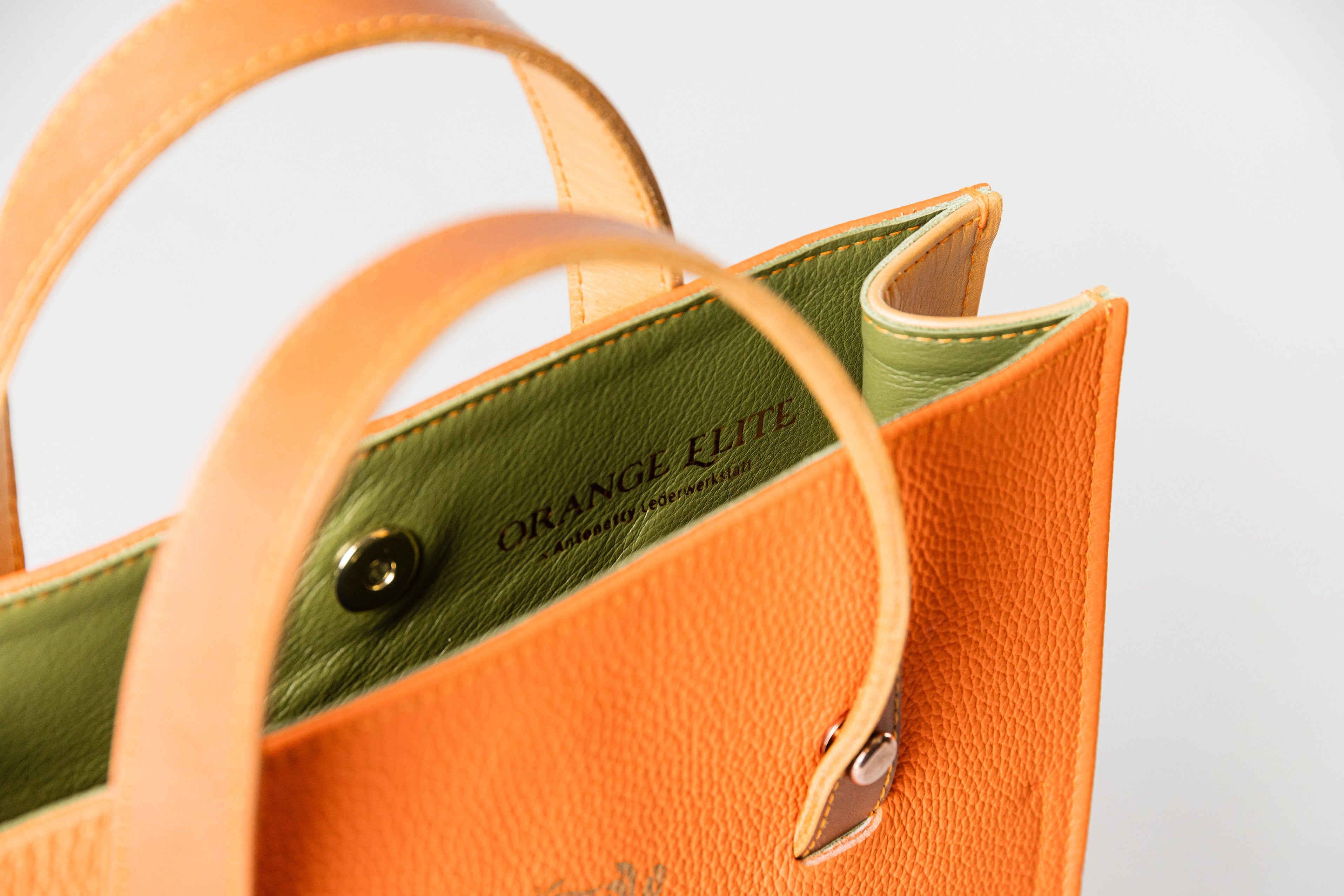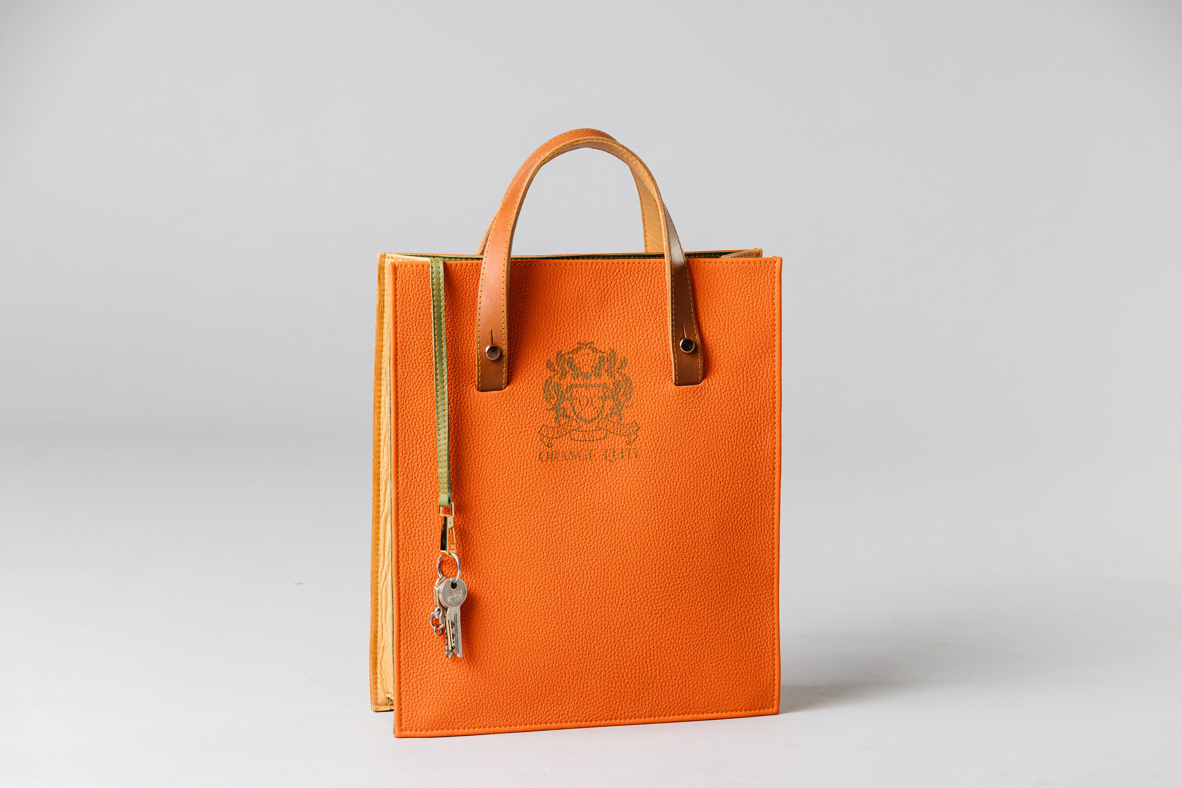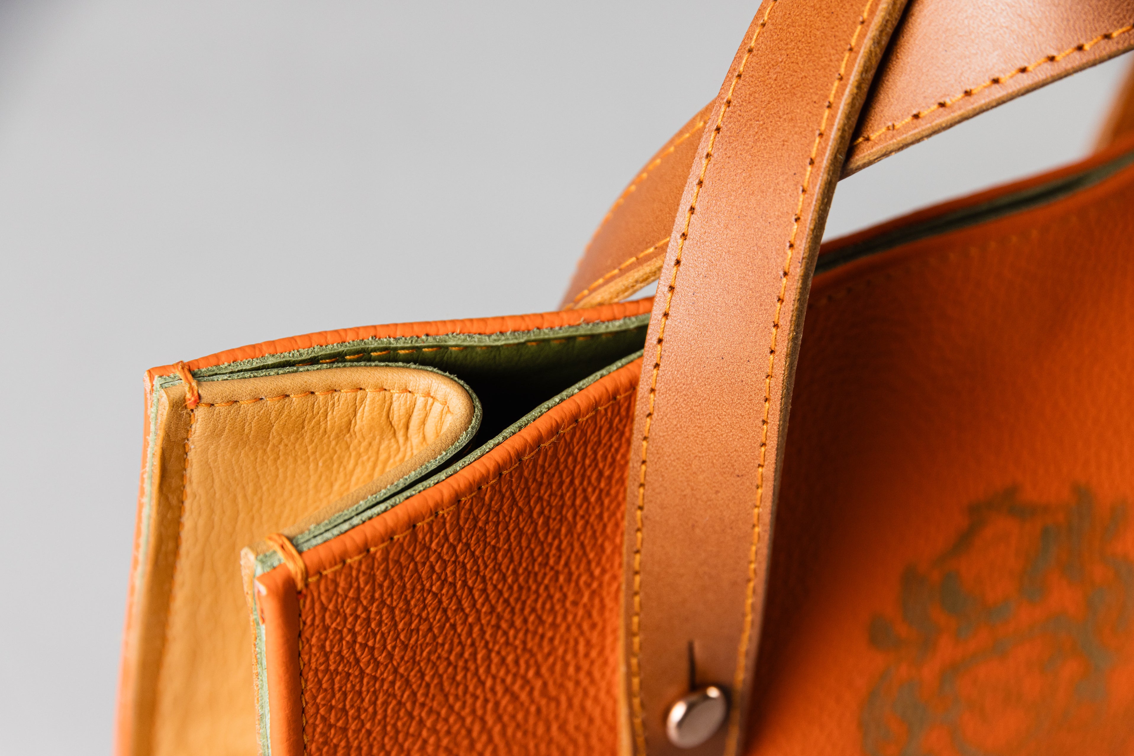 This luxurious handbag is made entirely from 100% cowhide leather. The outer material is premium French full-grain leather in vibrant red-orange, while the sides are crafted from the same orange leather like the blocktraveler for a harmonious design. Inside, it features smooth green leather from Italy.